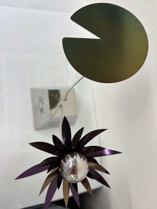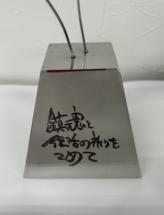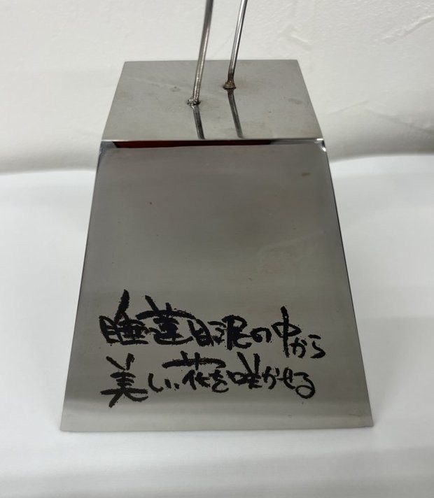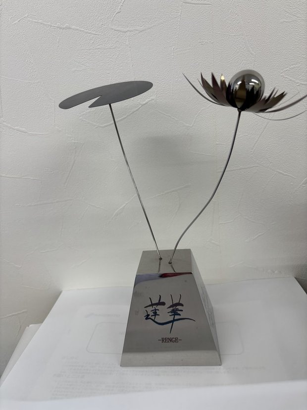 お祝いの胡蝶蘭がロビーを埋め尽くす中、唯一の金属工芸品でした。